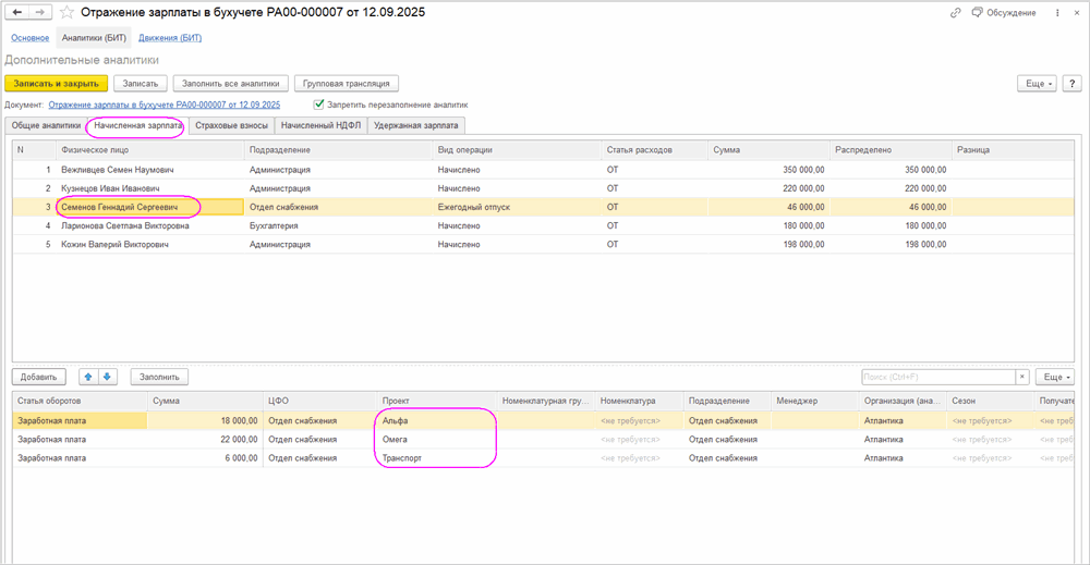При проведении документов по начислению заработной платы система формирует факт по ФОТ в бюджете и дает возможность разнести суммы ФОТ, страховых взносов, НДФЛ и удержаний по ЦФО, проектам и другим аналитикам. Такое распределение обеспечивает точный план‑фактный анализ затрат на персонал в разрезе подразделений и направлений деятельности.