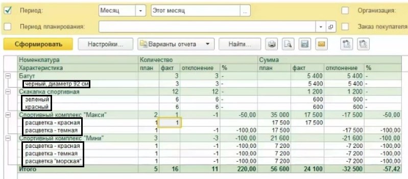 Вместе с номенклатурной позицией вы получите информацию о ее характеристиках по плану и фактам.