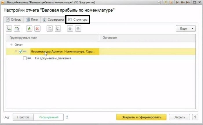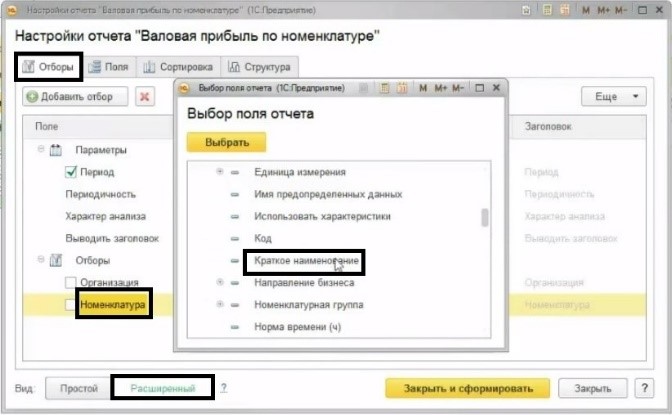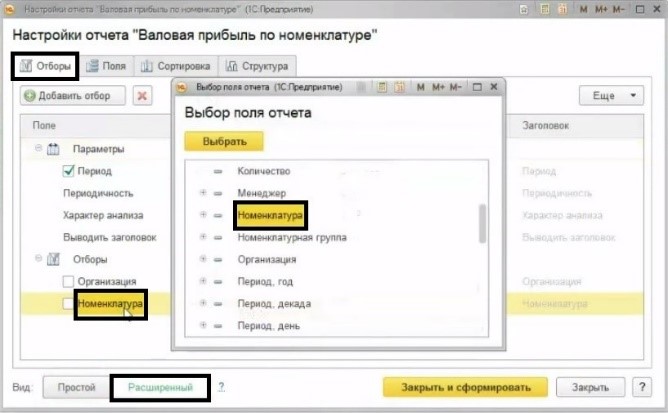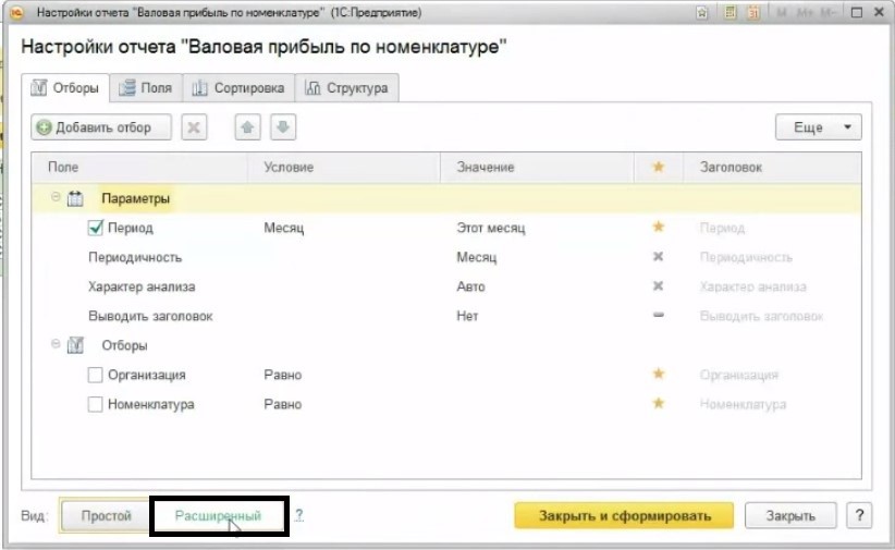 В разделе «Анализ» используется отчет «Валовая прибыль по номенклатуре». Нам потребуется не стандартный вариант отчета, поэтому откроем «Настройку» и выберем «Расширенный» вид.