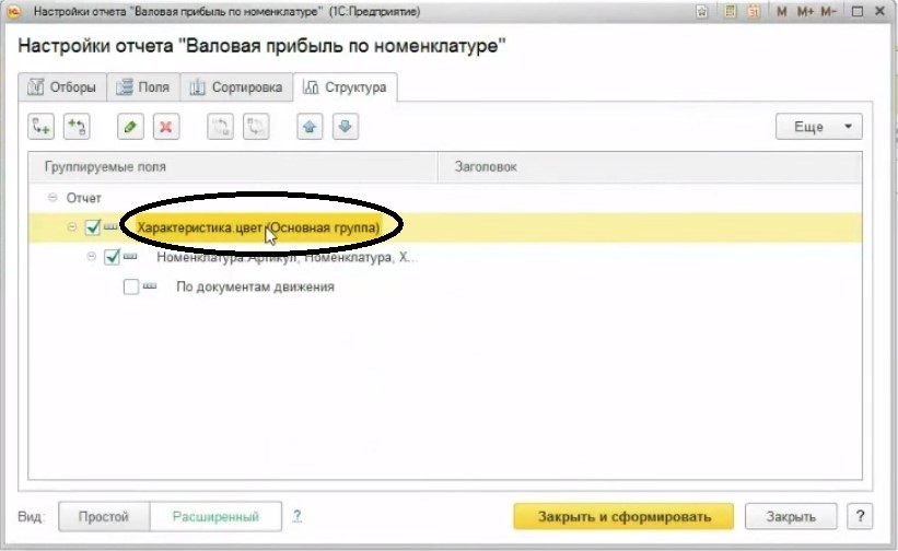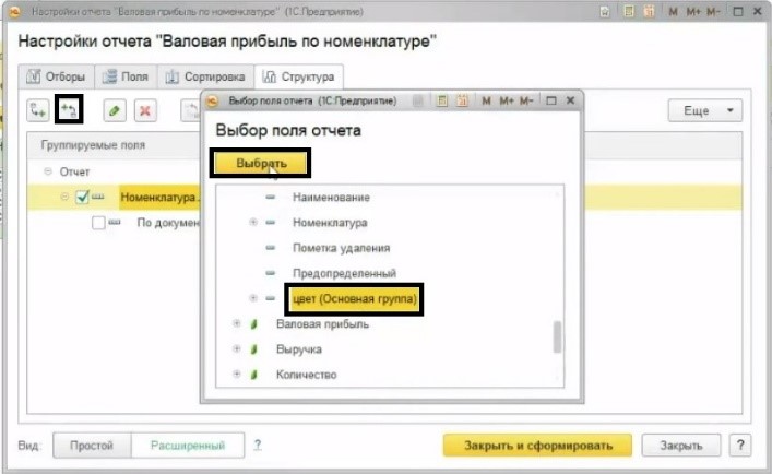 Далее в «Структуре» отчета требуется добавить новую группировку по цвету нужной номенклатуры.