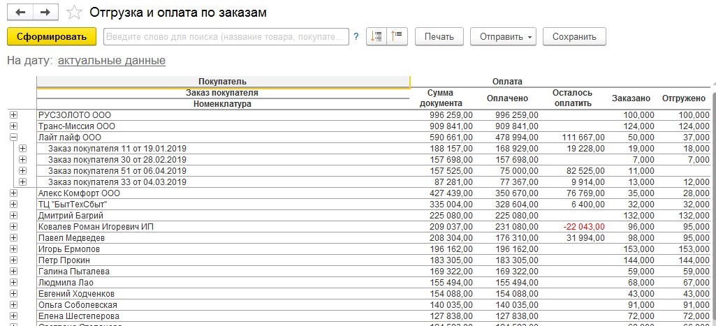 Отчет «Отгрузка и оплата по заказам» покажет, какие заказы были сделаны, по каким из них поступила оплата, и какие суммы еще остается оплатить. Здесь же будет информация об отгрузке.