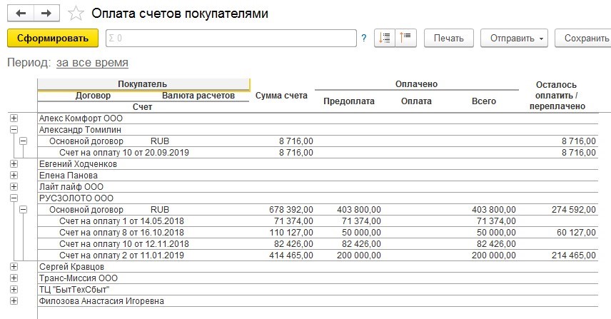 Информацию об оплате счетов покупателей содержит отдельный отчет «Оплата счетов».