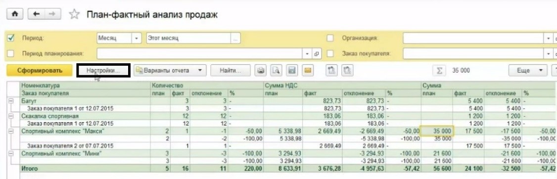 Открываем раздел «Анализ», выбираем отчет «План-фактный анализ продаж» и формируем его. Если не производить никаких дополнительных настроек, то данные будут показаны по умолчанию. Отчет содержит:
