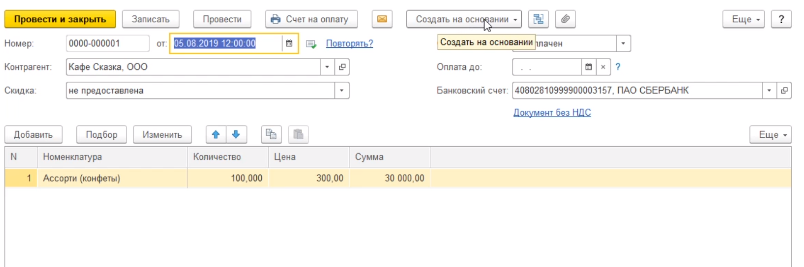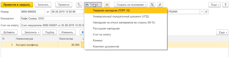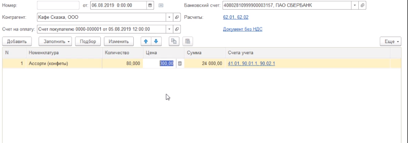 В нашем случае мы выставляли счет на сто единиц конфет ассорти. Необходимо отредактировать эту цифру до фактической отгрузки - восемьдесят штук. Мы это делаем вручную, прямо непосредственно в документе.