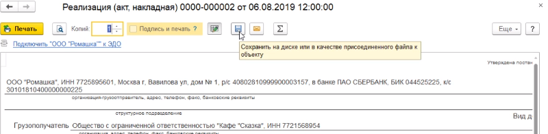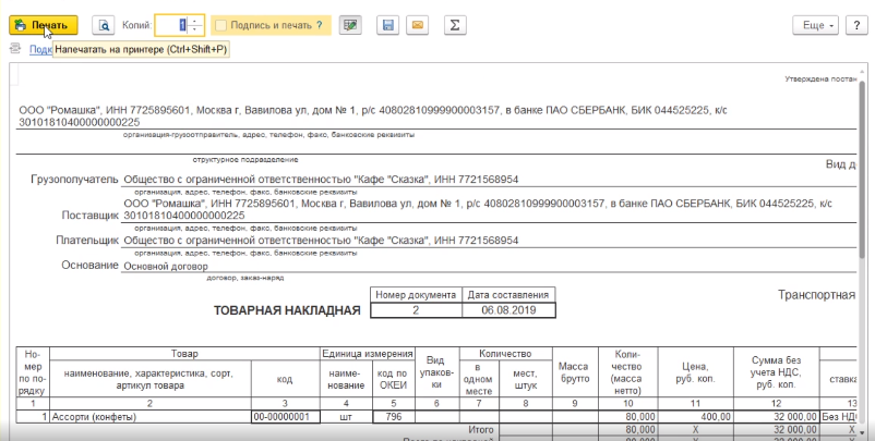 По кнопке печать переходим в раздел товарная накладная (ТОРГ-12).