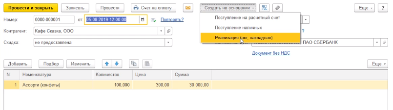 Если у нас в программе уже был сформирован счет покупателю, то документ реализации товаров для экономии времени мы можем создавать на основании этого выставленного счета.