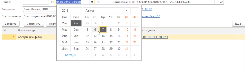 Нам здесь остается только в случае необходимости отредактировать дату документа. Например, здесь выберем не сегодняшнее, а вчерашнее число.