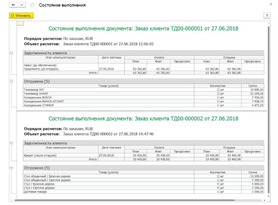 Отчет "Состояние выполнения заказов клиентов" формируется из индивидуального раздела "Заказ клиента". Он отражает состояние заказа – внесена оплата покупателем или нет. В форме также представлена информация о том, был ли уплачен аванс, в какие даты и на какую сумму производилась отгрузка партии товара.