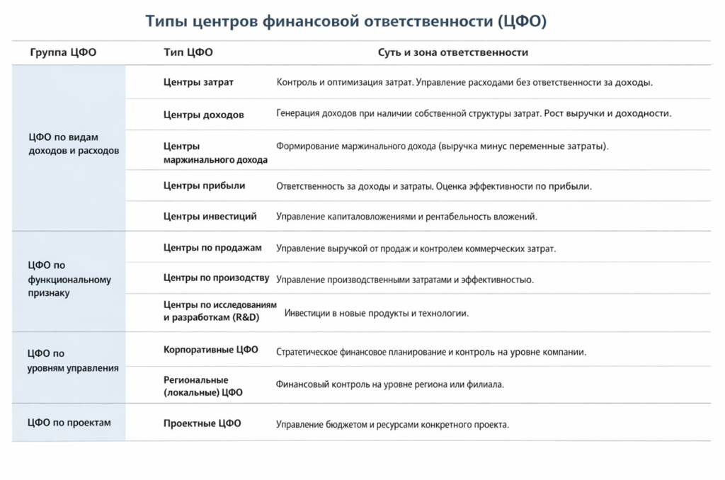 По мере роста бизнеса и усложнения структуры типовой классификации часто становится недостаточно. В этом случае ЦФО дополнительно выделяют по функциональному, управленческому или проектному признаку.